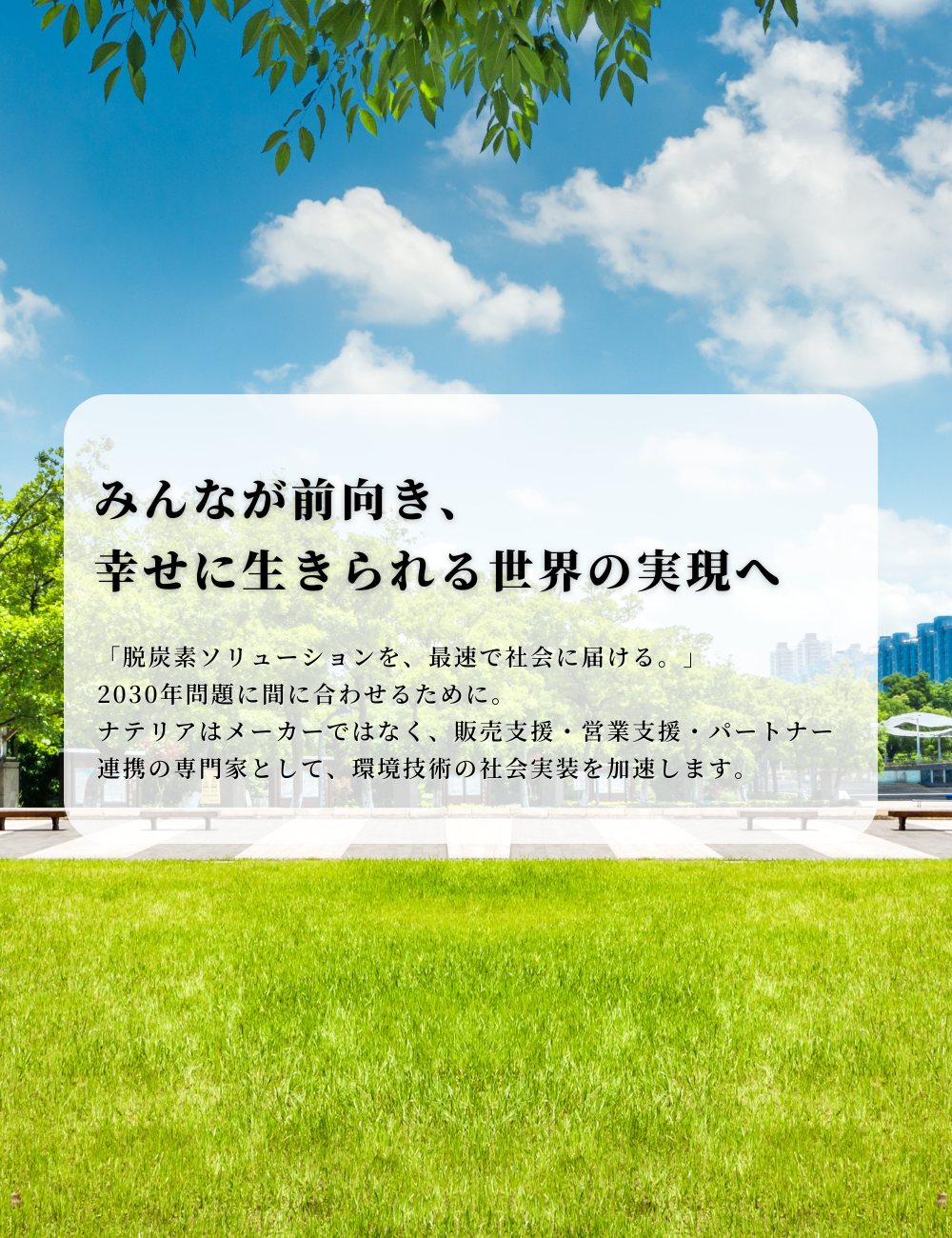 株式会社ナテリアは、2030年問題をはじめとする地球規模の課題に立ち向かうために生まれました。私たちはメーカーではありません。私たちの役割は、優れた環境技術やサービスを社会に広げることです。